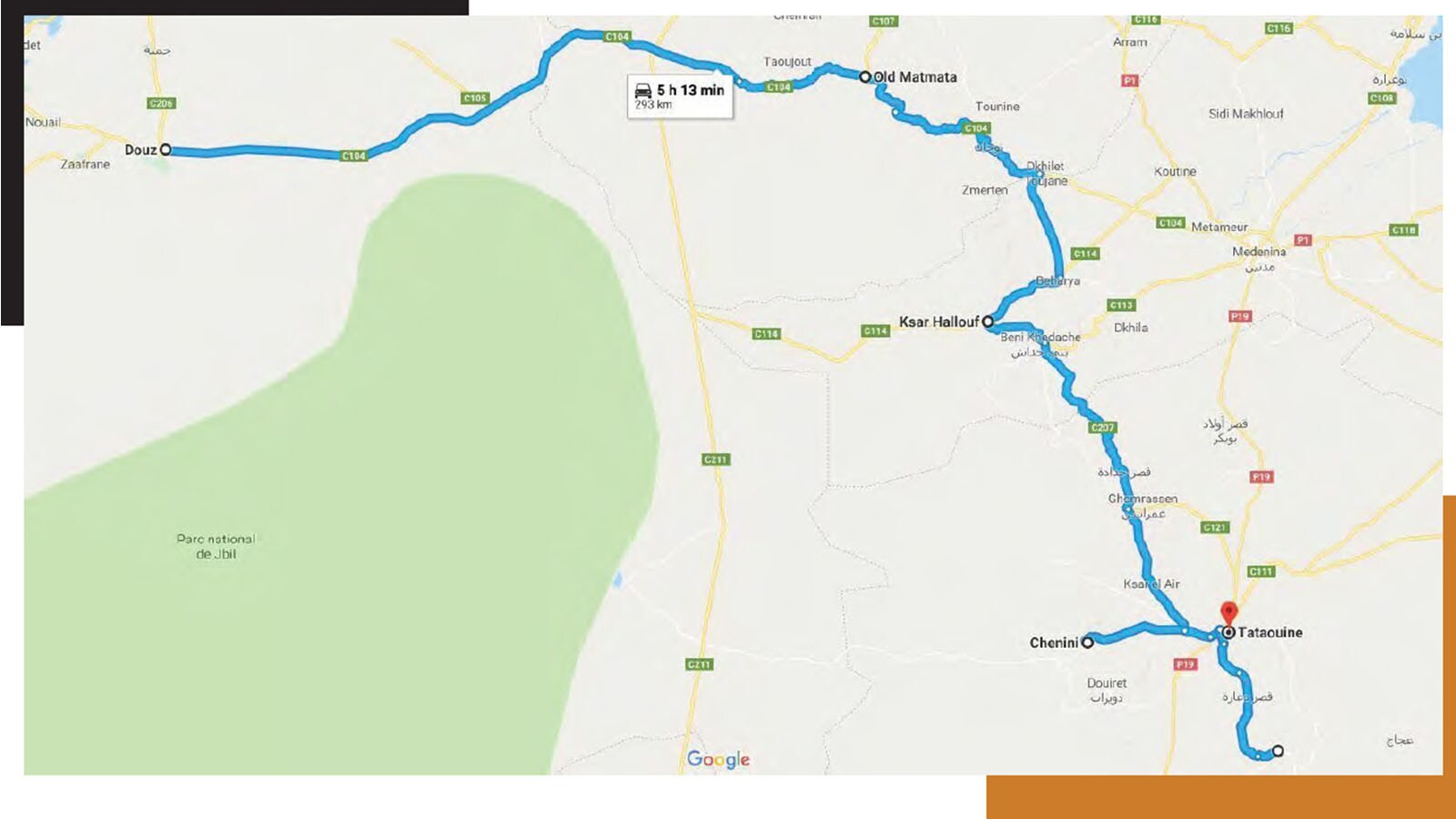 By the time we leave the sun has set, though the temperature has still not dropped. We cover the few miles separating us from Tataouine, hypnotised by the last flares of the vermilion sunset, projected onto the mountains as if they were part of an enchanting shadow play, with a long trail of red tail lights wagging joyfully in front of us.