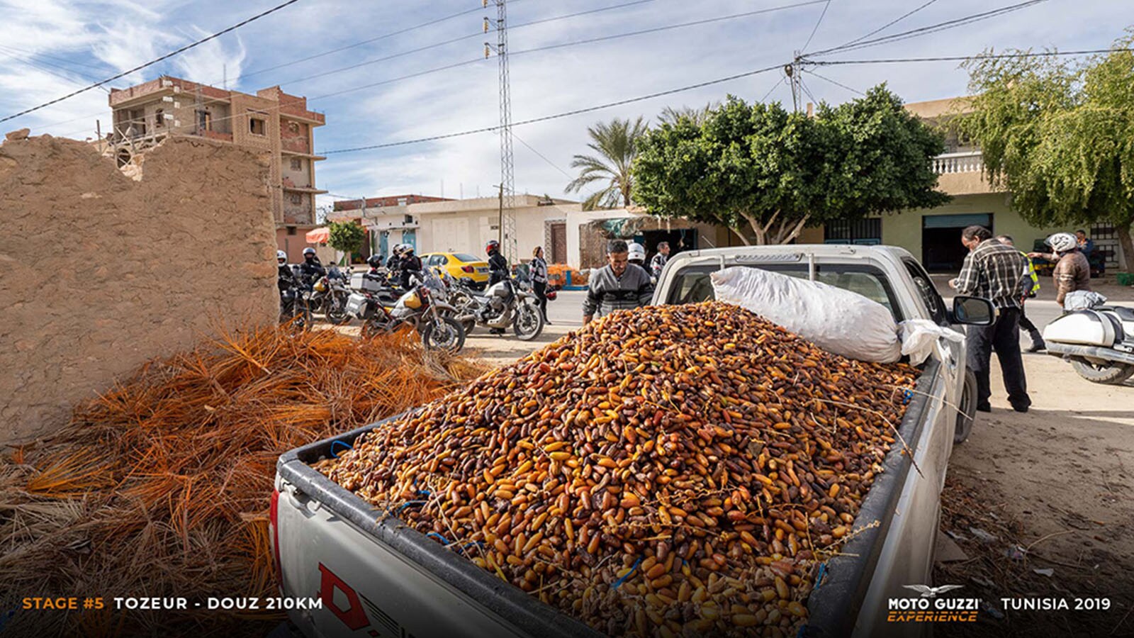 Having seen the potential of the Tuttoterreno with our own eyes, one of us finds the courage to try his hand at challenging the dune, to baptise his own V85 TT with the sand of the Sahara, which is not just any desert, but one that gave its name to the iconic yellow, white and black livery of his bike. As they say, opportunity never knocks twice. The daredevil climbs with no problem, followed by a resounding ovation, but on the way down things gets complicated, and after just a few metres the soft dune swallows his front wheel, sending him legs in the air in slow motion, amidst uproarious laughter.Once the sand has been cleaned off the V85 TT, we return to Tozeur for an outdoor lunch in typical Arab style, immersed in the city oasis under the shade of one of the largest palm groves in the world. Here, every meal ends with dates: Tozeur is considered the world capital of dates and we are tasting the Deglet Nour variety, considered the absolute best among the more than 180 known varieties. As the saying goes, “The more you get, the more you want”, and leaving the city we end up bargaining for the purchase of a 10 kg box that we’ll share at the end of the trip.
