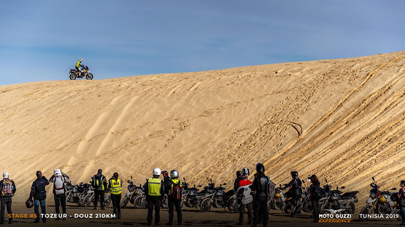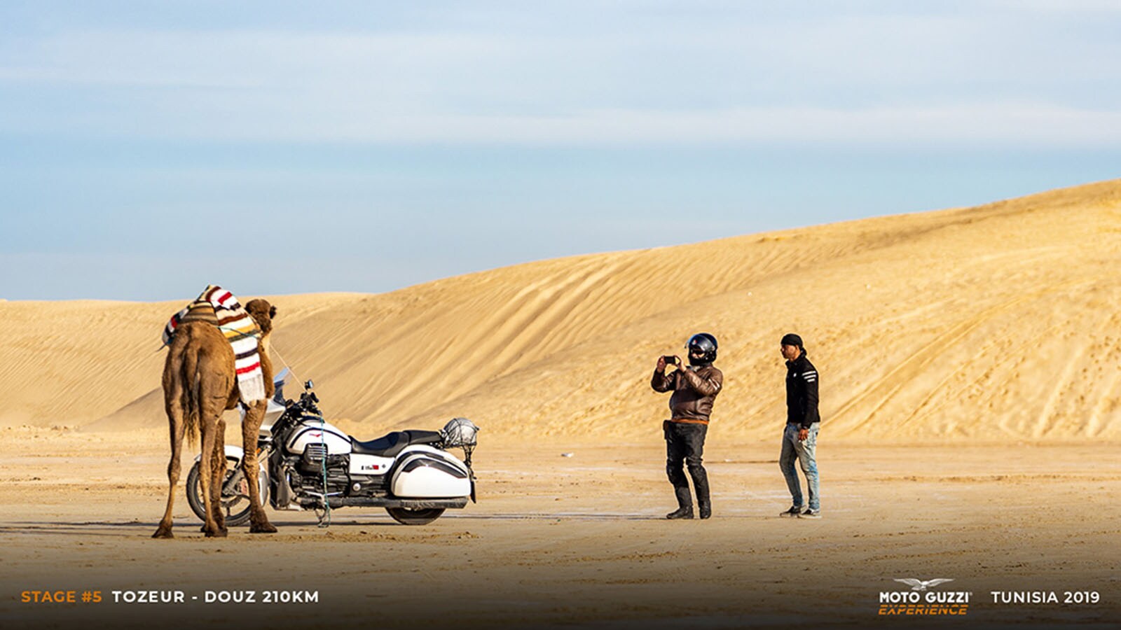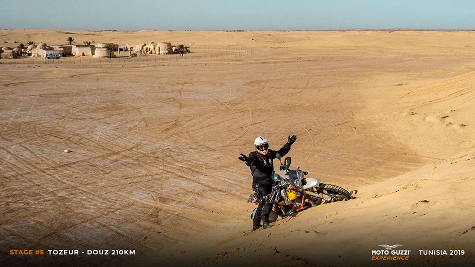 Ong Jmal owes its name to a strange formation of sandstone that resembles a camel’s neck (literally: Ong Jmal), and it is said that it was right here that the American filmmaker found the inspiration to create the Star Wars universe. What remains today is a good part of the structures of the set of “Mos Espa” (as it was called in the films) and a group of locals ready to welcome visitors with their dromedaries: “Un dinar, un dinar pour la photo, s'il vous plaît!”. This “touristic” approach, in the most ordinary sense of the word, almost reassures us: at least here some of the business seems to survive. So, while we visit the set, we let ourselves enjoy a few camel rides, ending in a group photo of bikes, riders, and camels lined up, and finding ourselves shouting comically unclear instructions in a jumble of languages: “That camel needs to be moved at least two metres further over! Yes, like that, sitting, not standing!”. But it’s not just a chance to have a good laugh, as we also take the opportunity to wear the (VESPA 946)RED T-shirts, in support of the Global Fund to Fight AIDS, which provides essential HIV/AIDS drugs to villages in sub-Saharan Africa. We’re sure that, just for today, the Moto Guzzi Eagle will forgive us.It’s almost time to get back on the road, but it's impossible to resist the completely empty clearing at the foot of the imposing sand dune adjacent to Ong Jmal. A nod of approval from the guides and we unleash ourselves into a whirling motorbike carousel on the sandy square, where some of the more clever among us hint at some drift, while others simply enjoy the show, savouring these moments of pure freedom on the seat of our Guzzi bikes. We feel like kids again, but one of our expedition's “dads” decides to give us a demonstration of how grownups do it. One of our guides climbs onto a V85 TT – selects Off-Road riding mode – and charges towards the climb to the dune with the engine revved up. He goes up and down several times, caressing the ultra-fine sand (it looks almost like talc) with the front tyre, raising fountains of dust with the rear one, without a hint of smearing and with the confidence of those who are not at their first rodeo.