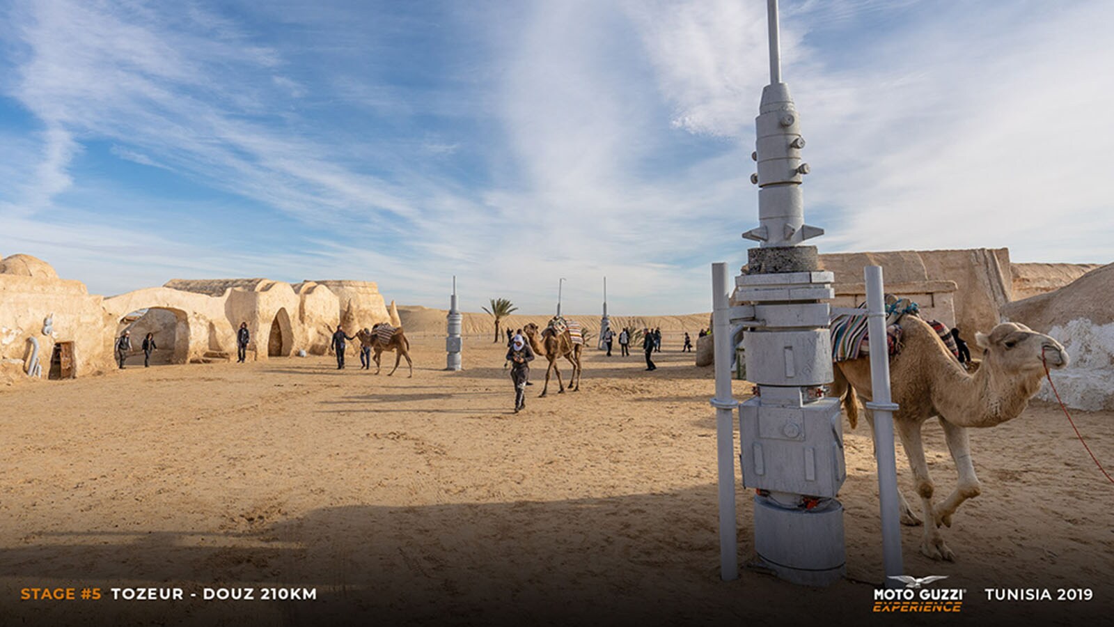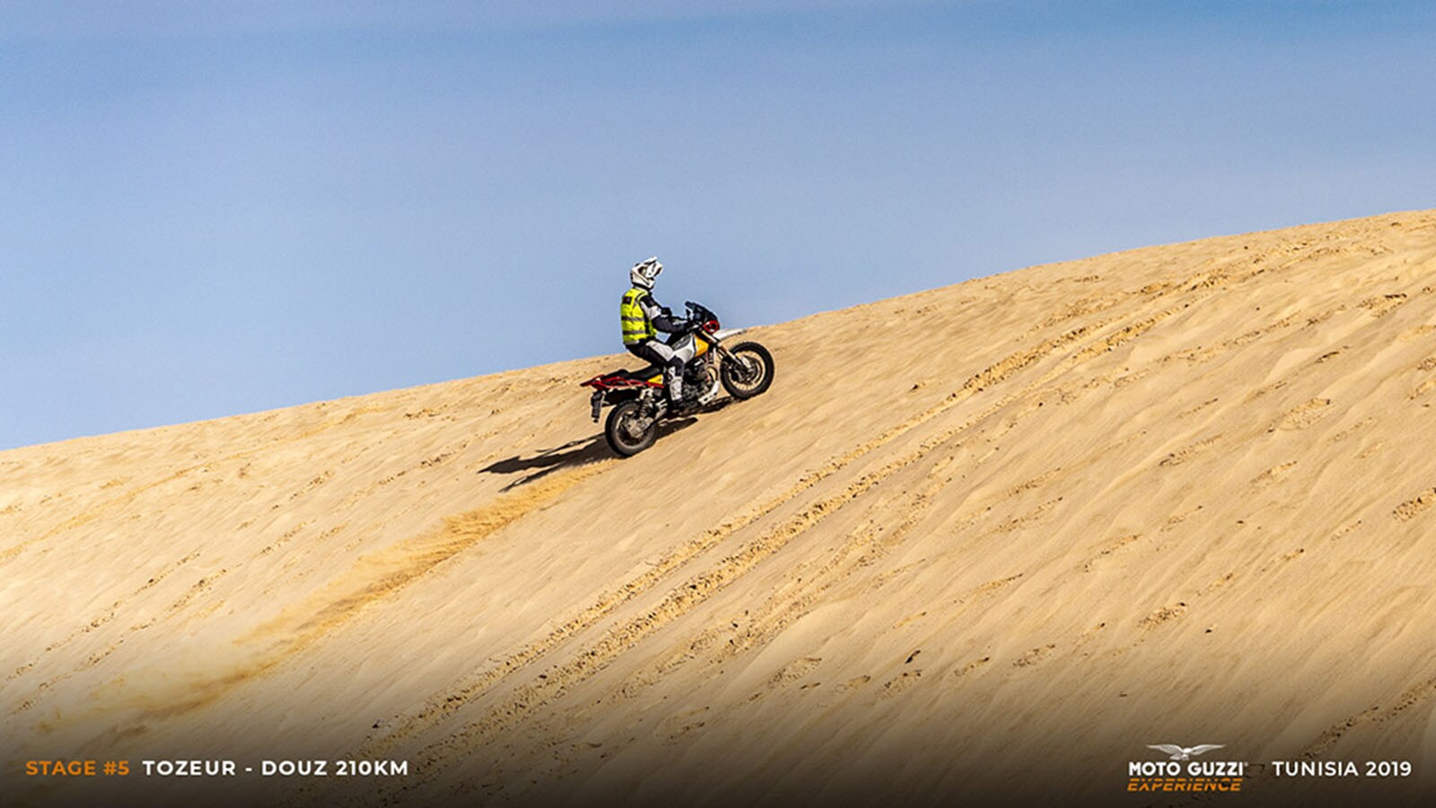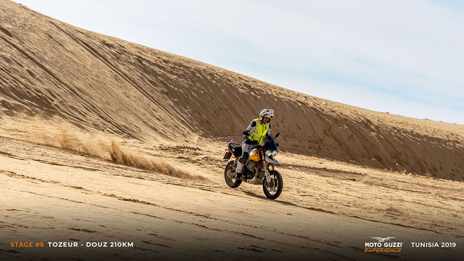 Ong Jmal owes its name to a strange formation of sandstone that resembles a camel’s neck (literally: Ong Jmal), and it is said that it was right here that the American filmmaker found the inspiration to create the Star Wars universe. What remains today is a good part of the structures of the set of “Mos Espa” (as it was called in the films) and a group of locals ready to welcome visitors with their dromedaries: “Un dinar, un dinar pour la photo, s'il vous plaît!”. This “touristic” approach, in the most ordinary sense of the word, almost reassures us: at least here some of the business seems to survive. So, while we visit the set, we let ourselves enjoy a few camel rides, ending in a group photo of bikes, riders, and camels lined up, and finding ourselves shouting comically unclear instructions in a jumble of languages: “That camel needs to be moved at least two metres further over! Yes, like that, sitting, not standing!”. But it’s not just a chance to have a good laugh, as we also take the opportunity to wear the (VESPA 946)RED T-shirts, in support of the Global Fund to Fight AIDS, which provides essential HIV/AIDS drugs to villages in sub-Saharan Africa. We’re sure that, just for today, the Moto Guzzi Eagle will forgive us.It’s almost time to get back on the road, but it's impossible to resist the completely empty clearing at the foot of the imposing sand dune adjacent to Ong Jmal. A nod of approval from the guides and we unleash ourselves into a whirling motorbike carousel on the sandy square, where some of the more clever among us hint at some drift, while others simply enjoy the show, savouring these moments of pure freedom on the seat of our Guzzi bikes. We feel like kids again, but one of our expedition's “dads” decides to give us a demonstration of how grownups do it. One of our guides climbs onto a V85 TT – selects Off-Road riding mode – and charges towards the climb to the dune with the engine revved up. He goes up and down several times, caressing the ultra-fine sand (it looks almost like talc) with the front tyre, raising fountains of dust with the rear one, without a hint of smearing and with the confidence of those who are not at their first rodeo.