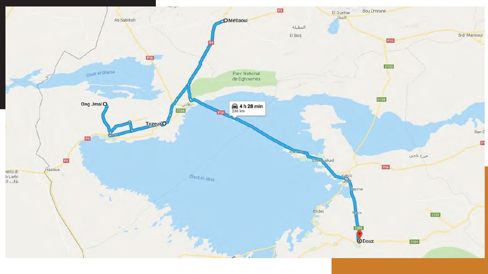 We are separated from Douz by the crossing of the vast salt lake Chott el-Jerid, which Herodotus described as “Lake Triton”. Although there is no concrete evidence, it is believed to be connected with the Mediterranean Sea (over 150 km away) because it seems to be affected by the flow of tides.