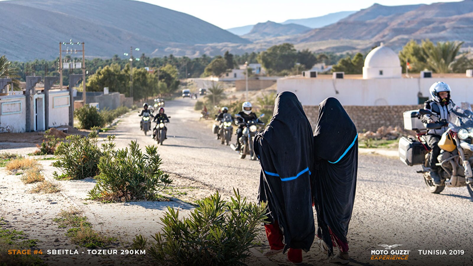 3) the Tunisian government cares a lot about its tourists, especially if they’re motorcyclists: the Tourist Police are waiting for us at the entrance of the hotel (not that they were invited). They’ll be escorting us - or, even better, freeing up the road with sirens ablaze - for the first few days of the journey, with a string of changes from one car to the next, like a well-orchestrated ballet performance, at the border of every governorate.We soon realise that the Tunisian police forces are better travel buddies than we could ever have imagined, considering their flexibility with speed limits, as we’re constantly trying to keep on track with our tight schedule, and their help getting us through the traffic on the outskirts of Tunis; they even seem to almost “tackle” cars and lorries to get them to allow us through. Essentially, thanks to the lights, sirens, and the rumbling of our twin-cylinder engines, there’s an immediate “presidential procession” effect. Heads turn, women wave, and smartphones film us (which we’ll see less and less of after leaving Tunis): “Who are they? Perhaps they’re Berber princes with their convoy of camels?”. At first it all seems kinda weird to us; this “circus” certainly does not help us to go unnoticed and blend into the scenery, but we’ll then discover, through the excitement in the eyes of our “spectators”, especially the children, that this striking bit of a commotion is about to reward us with some of the strongest emotions we’ll go through during the Moto Guzzi Experience Tunisia.