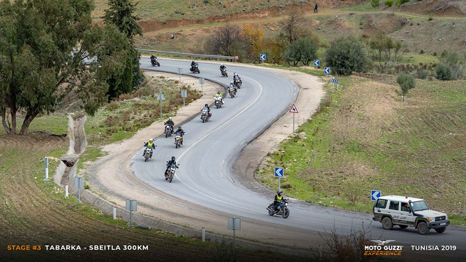 The weather hasn’t improved, so much so that upon leaving Tabarka, we don’t even realise that we’re near the sea, even if it is only for a few kilometres. However, waiting for us is a wonderful mountain road, with smooth curves and views of… the fog, which luckily breaks up at just the right time, as we cross the pass, with our bikes in single file and our visors still misted up. It is a display of verdant shades, saturated with rain drops; but further ahead, towards the south, there’s the sun, and that’s where we’re heading. Today and tomorrow, in fact, our wheels will be running alongside the border with Algeria: it is a highly militarised area, and seeing the armed soldiers reminds us how extremely limited access to tourism is beyond the border, and how going through this region on our Moto Guzzi bikes is a small privilege.