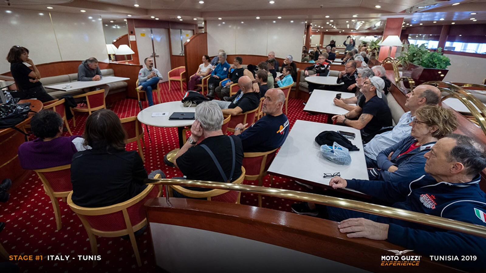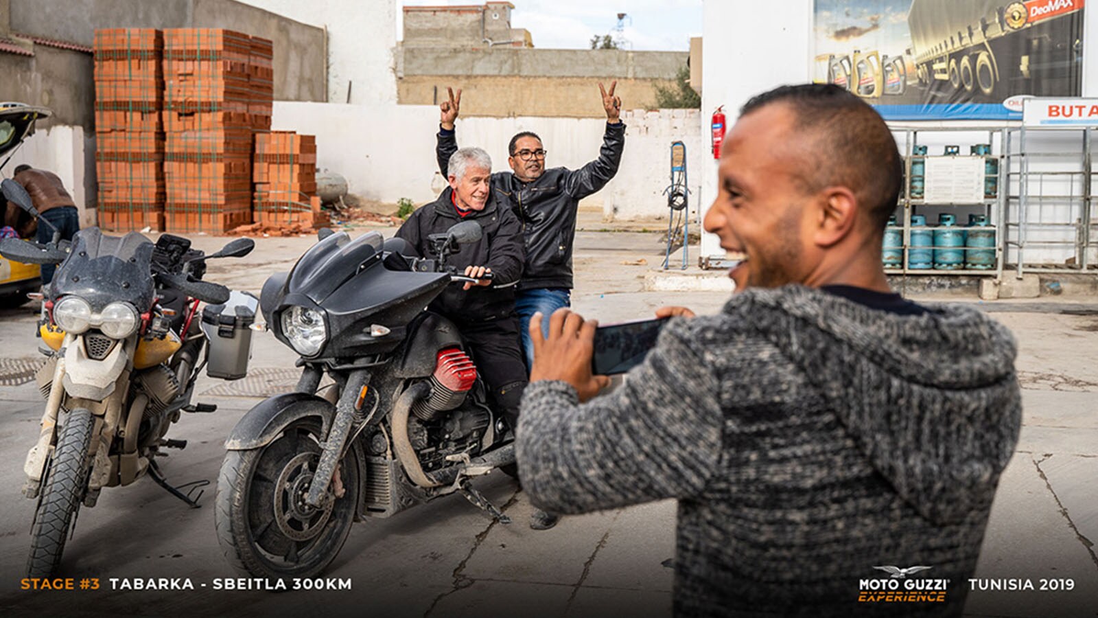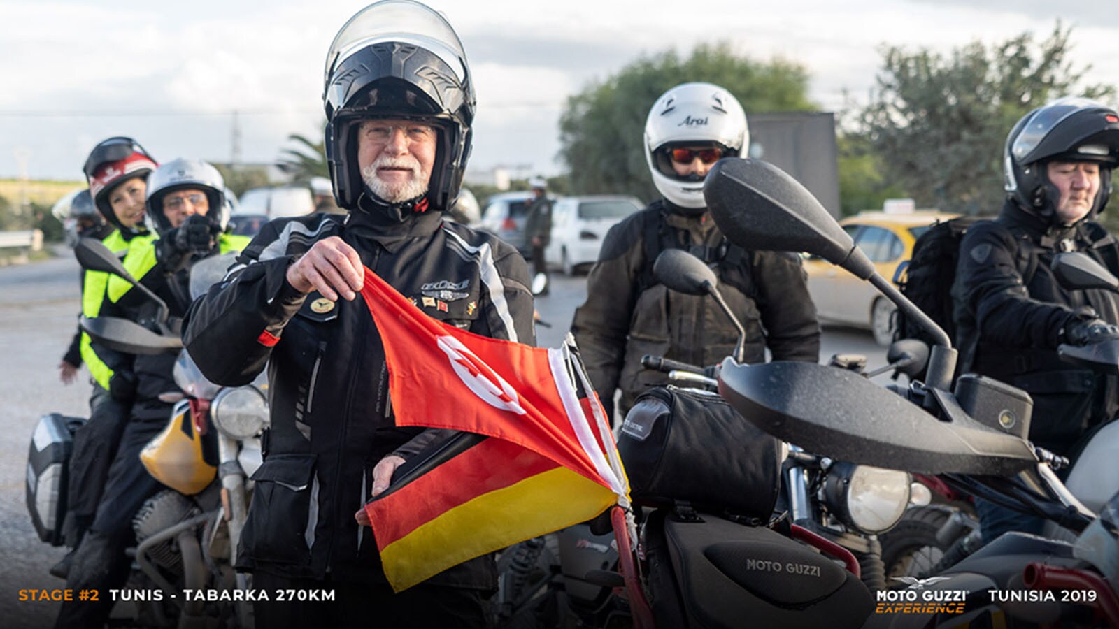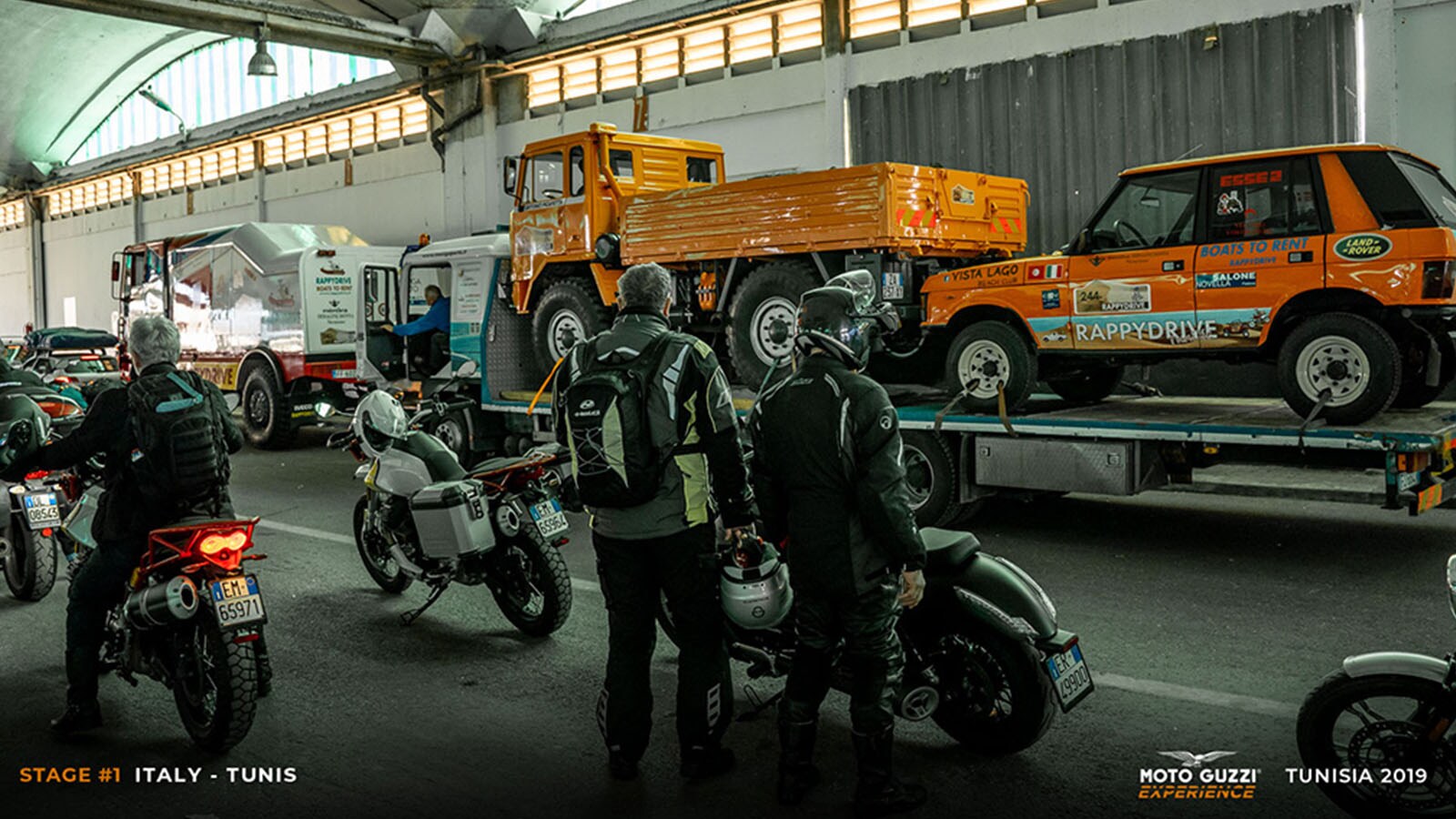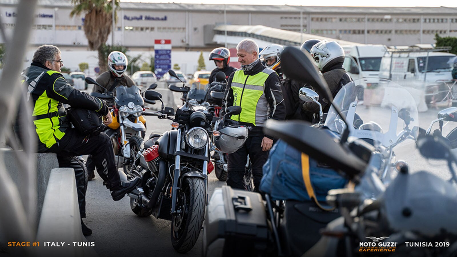 Strong winds and pounding rain plough down on our 26 Moto Guzzi motorcycles, which are ready and waiting to embark upon the Moto Guzzi Experience Tunisia. Was it an adventure we wanted? Well here it is!People say their farewells and then get in line to collect their TomTom Rider 550s, with each day’s route downloaded onto them, and the keys to our brand-new Moto Guzzi motorcycles. Some of us don’t need them, as we came on our own Moto Guzzi bikes, but now’s not the time for introductions: we’re off! We’ve got a ferry to catch and a 24-hour sea journey, but... hold on a moment: a traveller, just a bit too carelessly, rocks up on his super-equipped V85 TT, but without a passport. He manages to get it delivered to him from Milan just in time to “jump” on board the boat: tonight, drinks are on him!